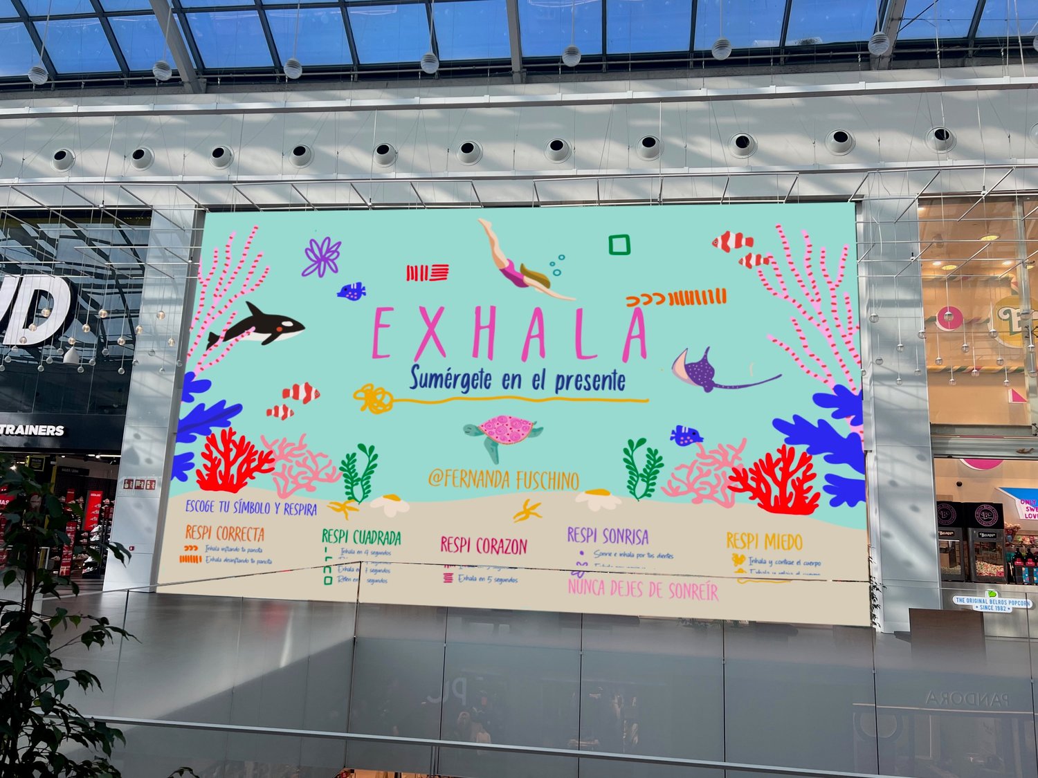 Cada mural combina diseño artístico con símbolos que enseñan técnicas de respiración consciente. Incluyen un código QR para que las personas accedan a un ebook exclusivo donde aprenden todo sobre la Respiración Consciente.